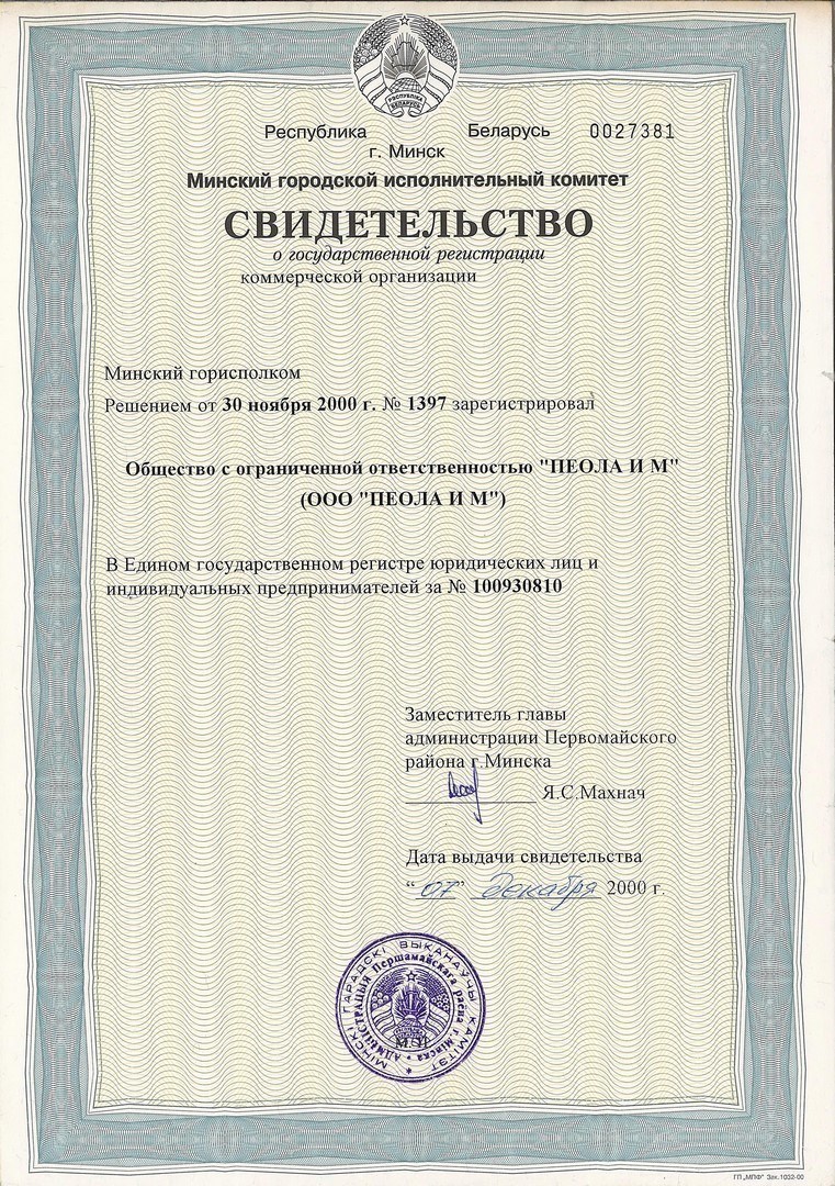 -Свидетельство № 100930810 решение Минского городского исполнительного комитета от «30» ноября 2000г. № 1397