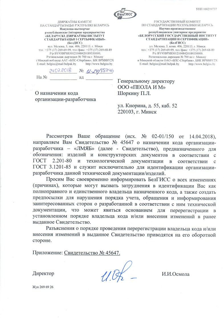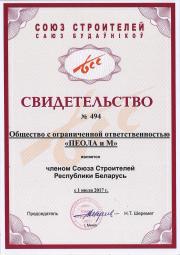 -Свидетельство о технической компентентности №37611520.902-2015 выдан РУП "БЕЛСТРОЙЦЕНТР", приложение "Область технической компетентности системы производственного контроля ООО "ПЕОЛА И М" на производтсво геодезических работ"
