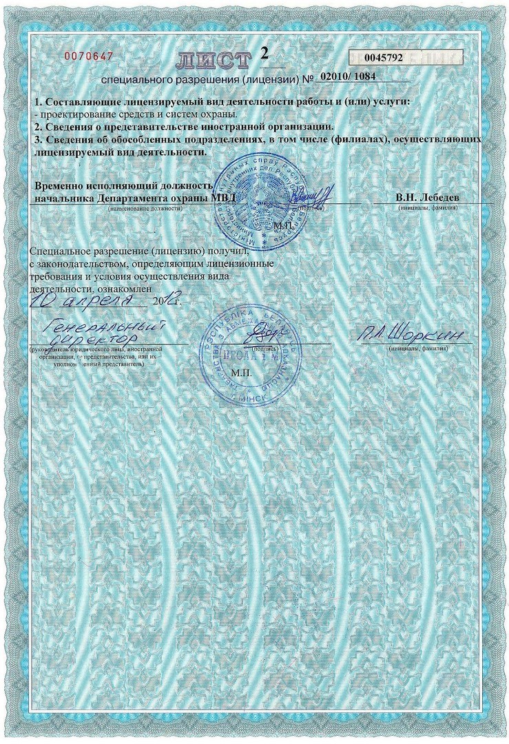 -Специальное разрешение (лицензия) Министерства внутренних дел Республики Беларусь № 02010/1084 продлена на основании решения от 13 марта 2012 года «Осуществление деятельности по обеспечению охранной деятельности» действительна до 17 апреля 2022 года.