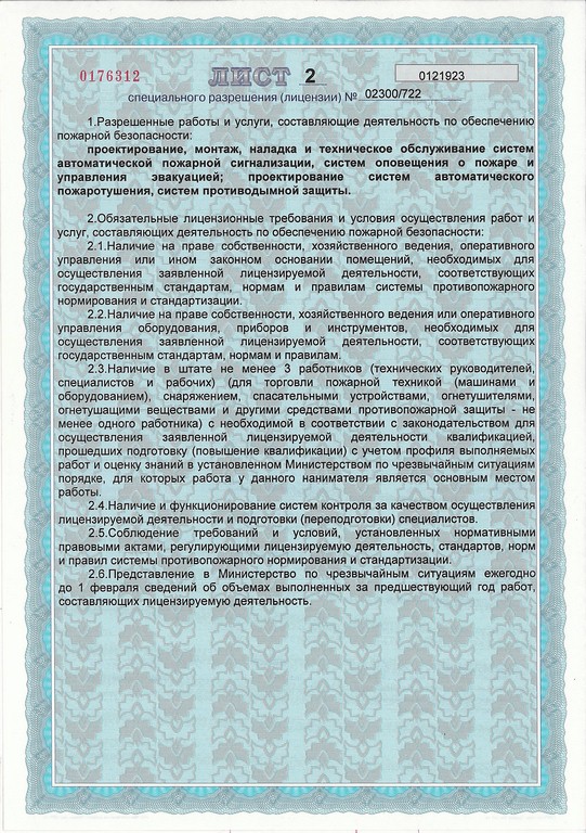 -Специальное разрешение (лицензия) Министерства по чрезвычайным ситуациям Республики Беларусь № 02300/722 продлена на основании решения от 25 мая 2015 года «Осуществление деятельности по обеспечению пожарной безопасности» действительна до 23 июня 2020 года.