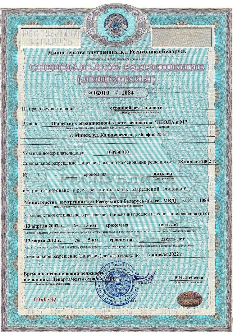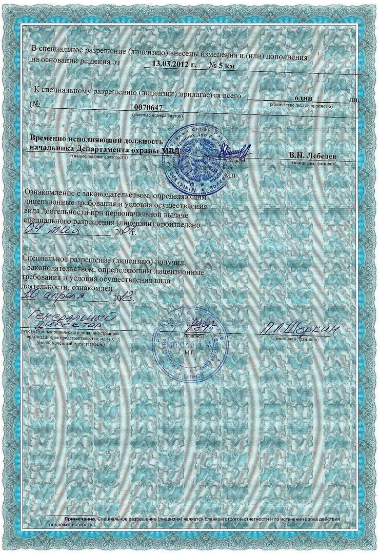 -Специальное разрешение (лицензия) Министерства внутренних дел Республики Беларусь № 02010/1084 продлена на основании решения от 13 марта 2012 года «Осуществление деятельности по обеспечению охранной деятельности» действительна до 17 апреля 2022 года.
