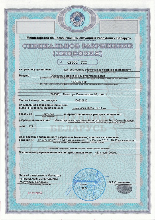 -Специальное разрешение (лицензия) Министерства по чрезвычайным ситуациям Республики Беларусь № 02300/722 продлена на основании решения от 25 мая 2015 года «Осуществление деятельности по обеспечению пожарной безопасности» действительна до 23 июня 2020 года.
