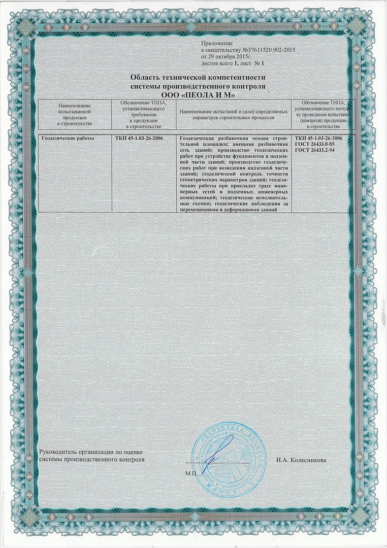 -Свидетельство о технической компентентности №37611520.902-2015 выдан РУП "БЕЛСТРОЙЦЕНТР", приложение "Область технической компетентности системы производственного контроля ООО "ПЕОЛА И М" на производтсво геодезических работ"